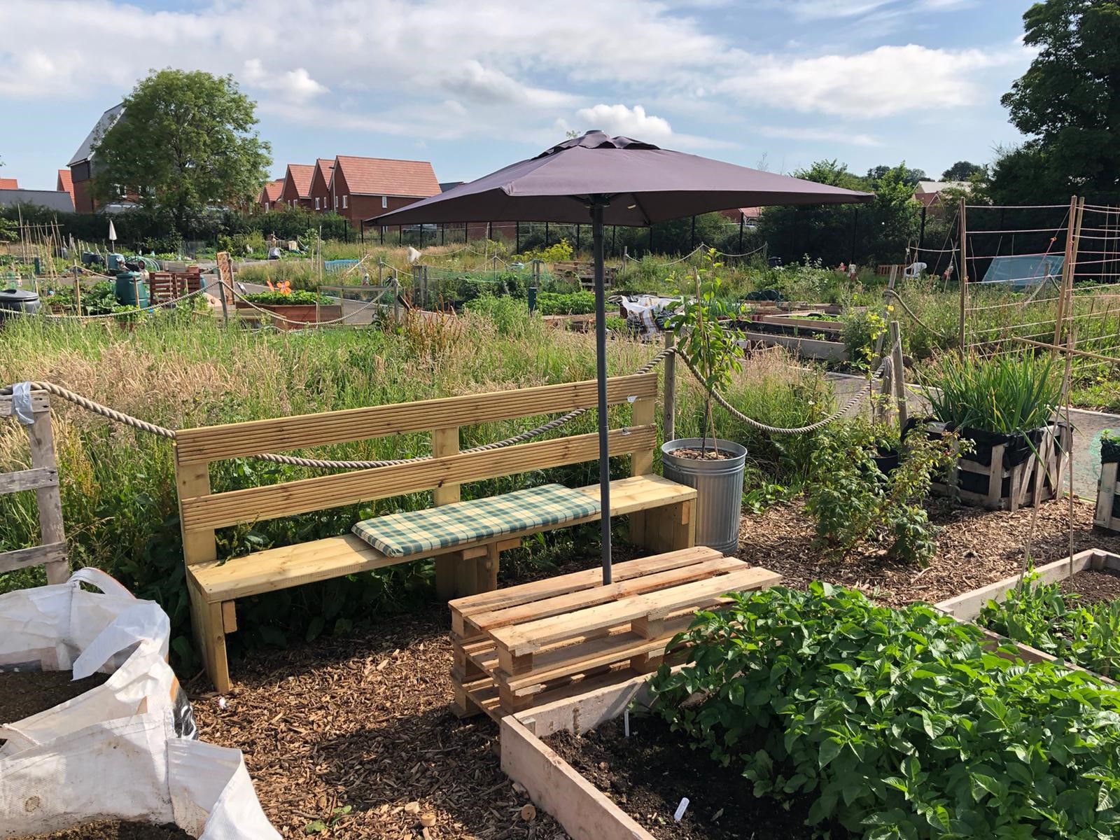 Next up was a bit of ‘up-cycling’, using some wooden pallets, spare decking planks and a donated shower screen to build a cold frame, a bench (specially designed to enable social distancing at over 2m in length!), and a coffee table for that well earned cuppa after a mornings work. Thanks to more kind donations, we even managed to finish the seating area off with a cushion and sun shade!